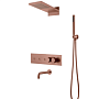 Система выполнена из высококачественной латуни с брашированным медным покрытием, что гарантирует долговечность и устойчивость к коррозии. Термостатическое управление обеспечивает комфортную температуру воды без резких перепадов, а керамический картридж обеспечивает плавность и точность регулировки.
