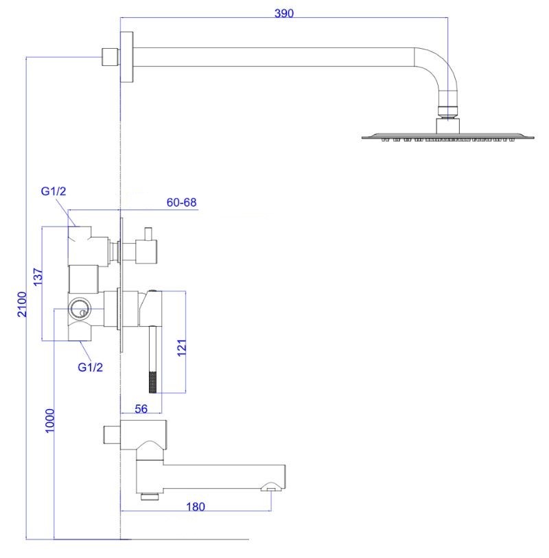 Управление осуществляется с помощью удобного рычажного механизма, что обеспечивает плавную регулировку напора и температуры воды. Благодаря стандарту подводки 1/2", установка не вызовет сложностей даже у опытных мастеров. Система предназначена для использования в ванной комнате с душем, что делает её универсальной для большинства планировок.