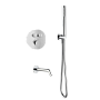 Встроенный смеситель термостат управляется удобным рычагом спереди, что делает настройку температуры и напора воды максимально простой и интуитивной. Пластиковый шланг длиной 150 см с защитой от перекручивания обеспечивает свободу движений, а ручной душ и излив для наполнения ванны делают систему универсальной для любых сценариев использования.