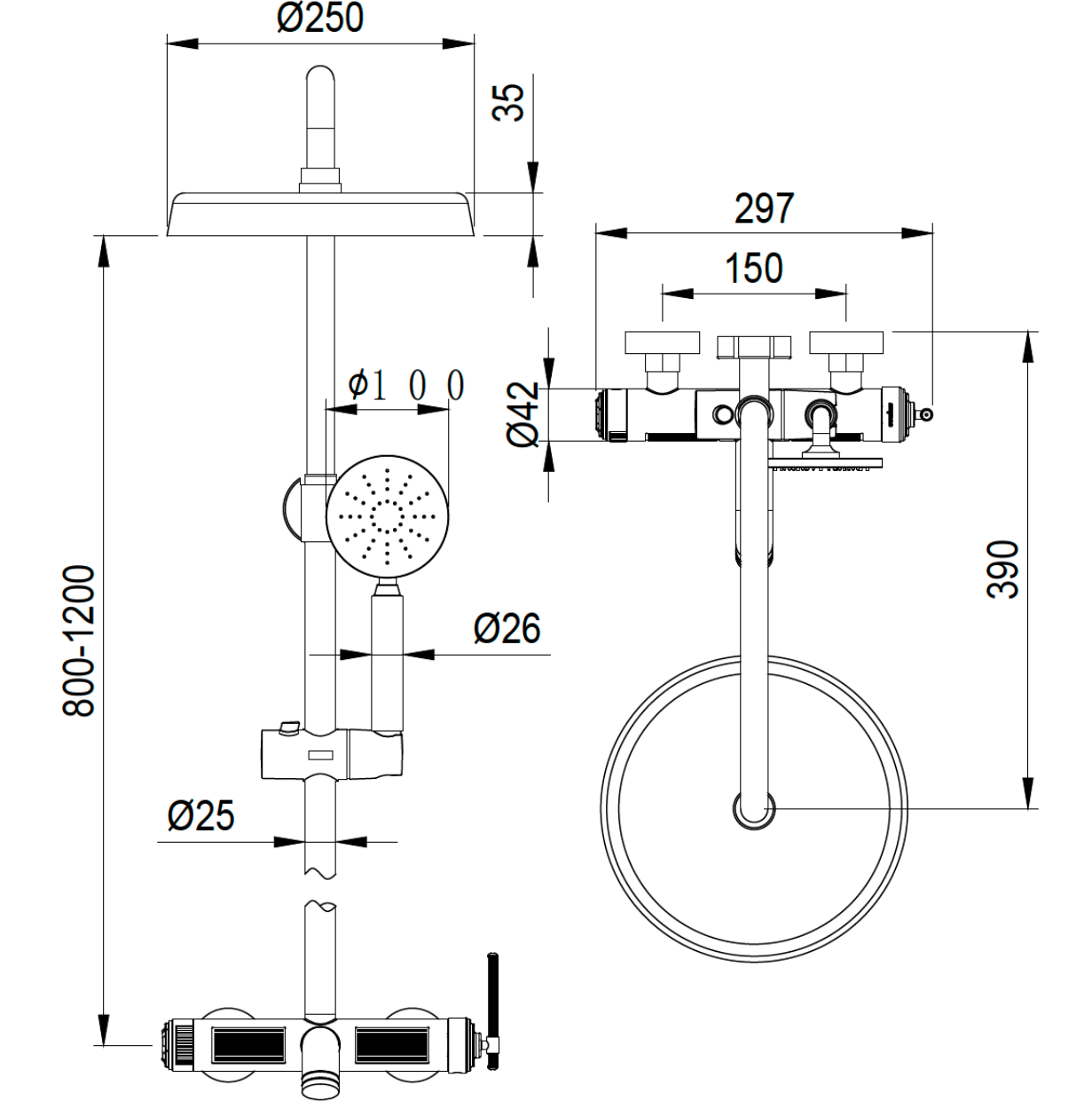 смеситель, шланг для душа, держатель для душа, переключатель потоков |