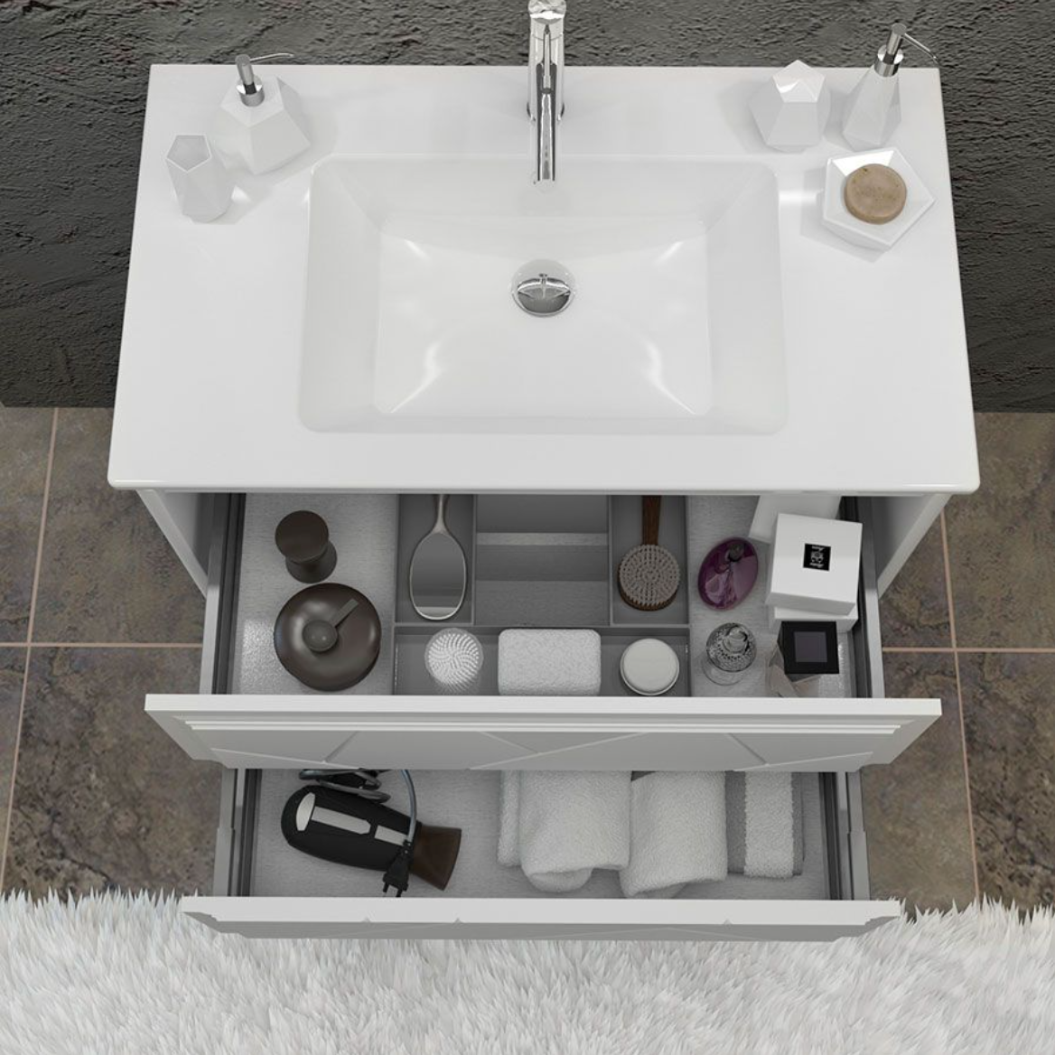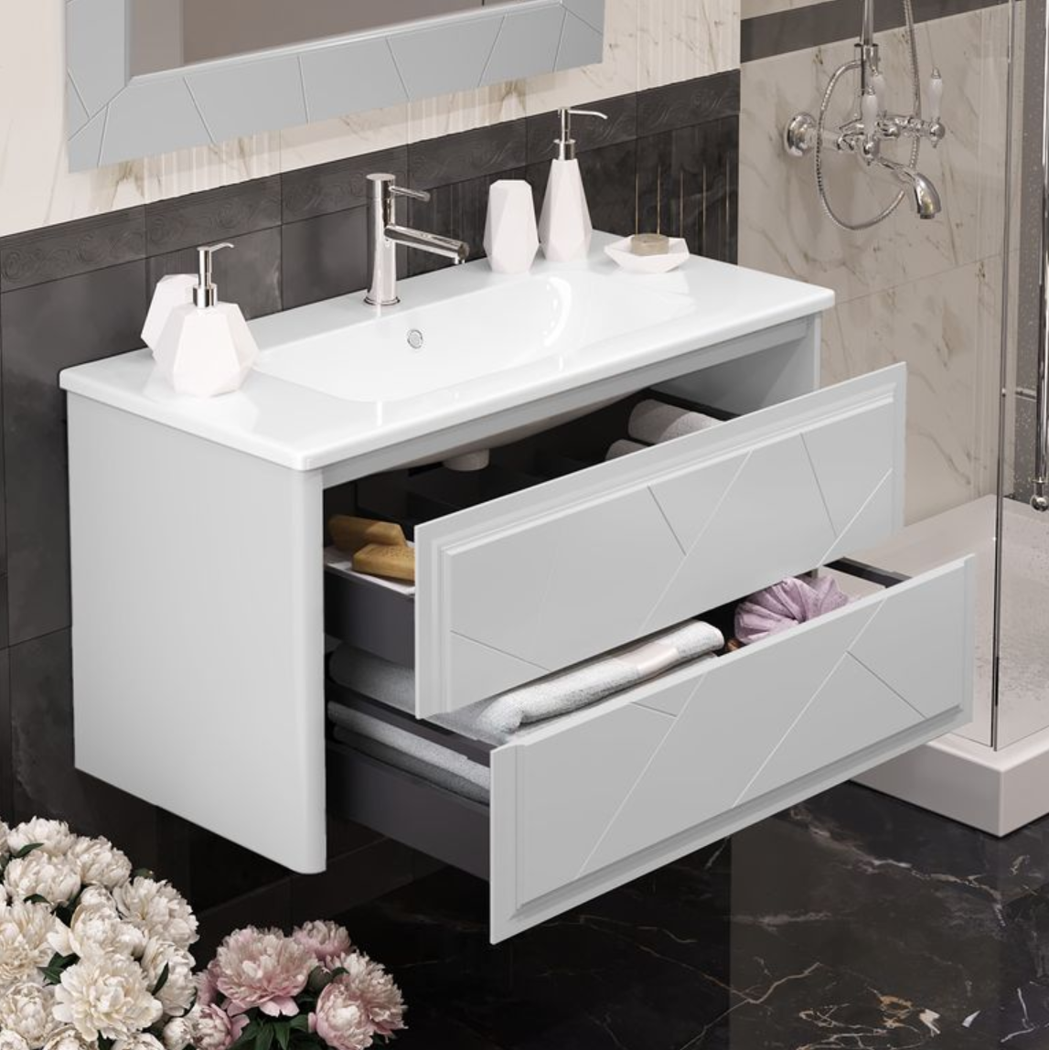 Одно из главных преимуществ — удобная система хранения с ящиками. Благодаря механизму доводчика, ящики закрываются плавно и бесшумно, не создавая лишнего шума в утренние часы. Отсутствие нажимного механизма открывания не мешает эргономике — фасад легко открывается обычным прикосновением. Внутри достаточно места для хранения полотенец, косметики и бытовой химии.