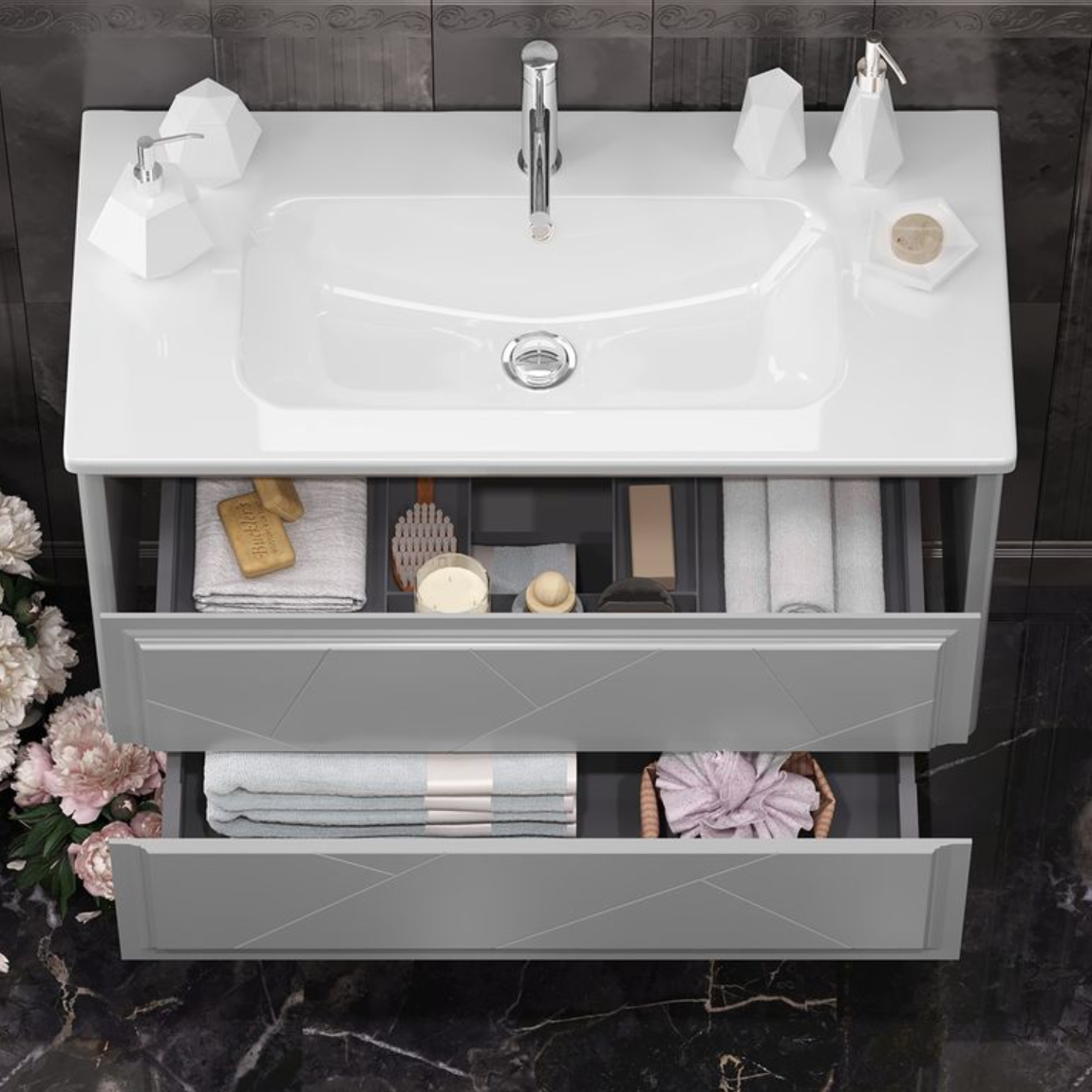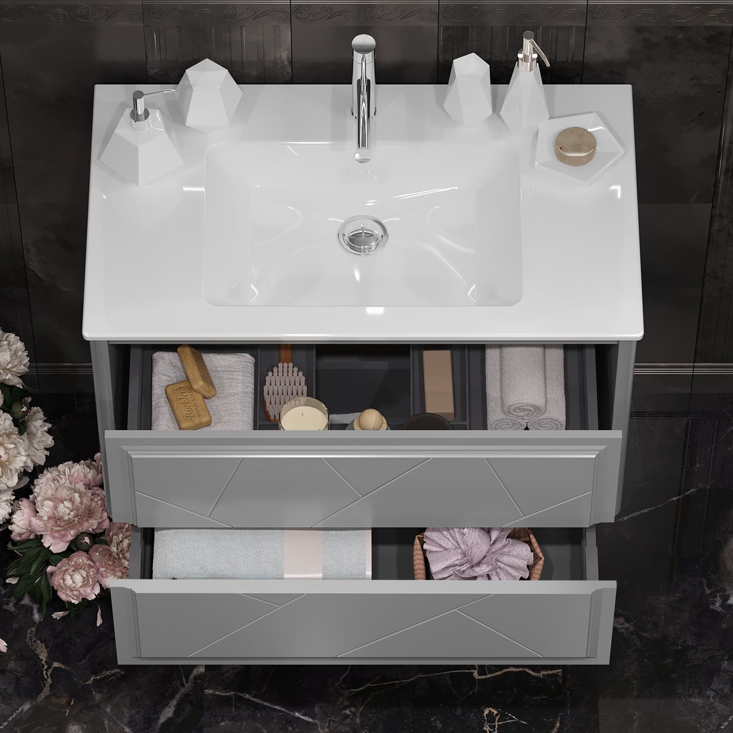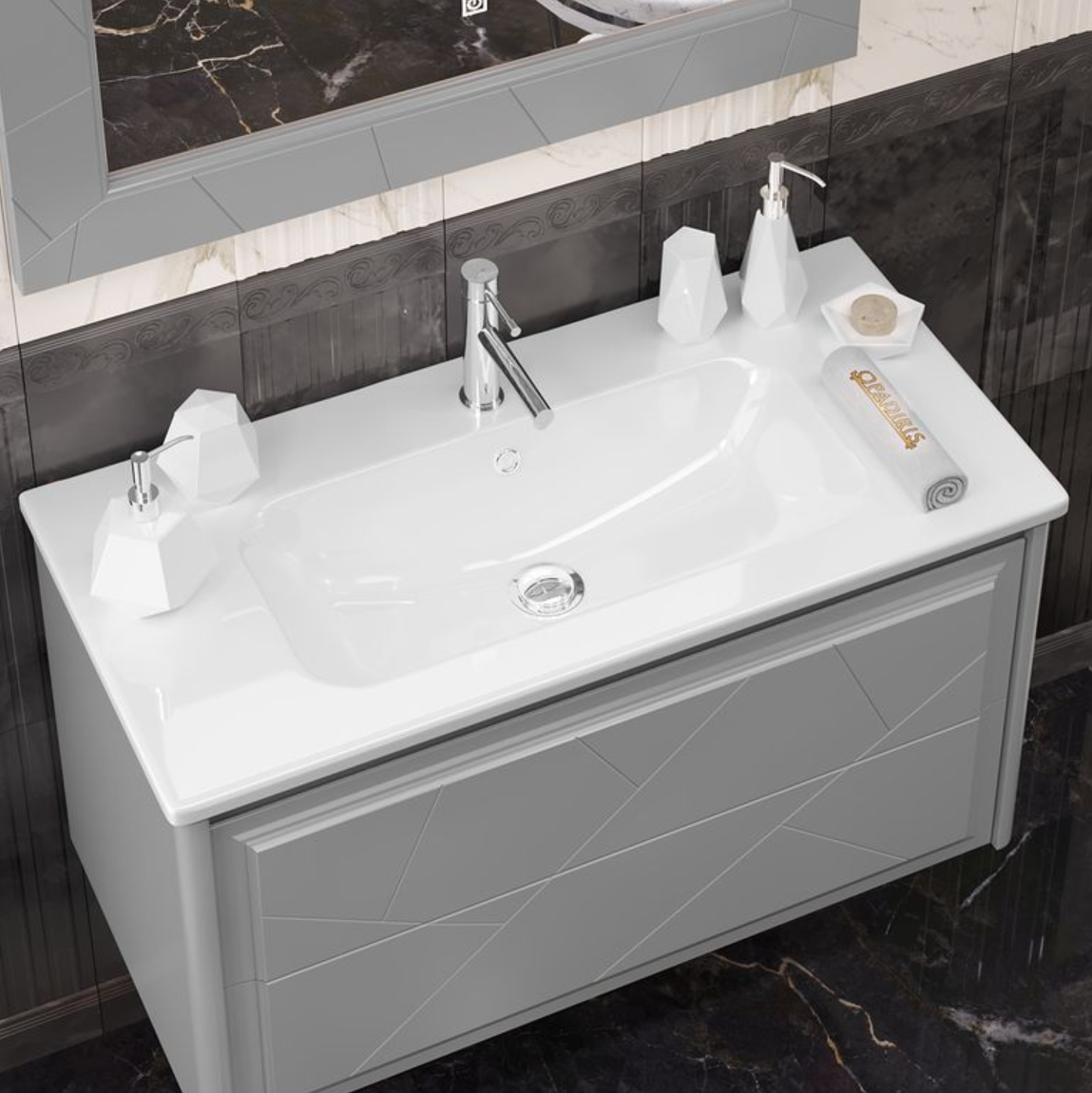 Фасад и корпус выполнены из высококачественного МДФ с эмалевым покрытием в глубокий матовый серый цвет. Это не просто красиво — это практично: эмаль устойчива к влаге, царапинам и ежедневному износу. Белая фаянсовая раковина с центральным расположением смесителя и диаметром слива 4,8 см обеспечивает удобство использования и легкость ухода.