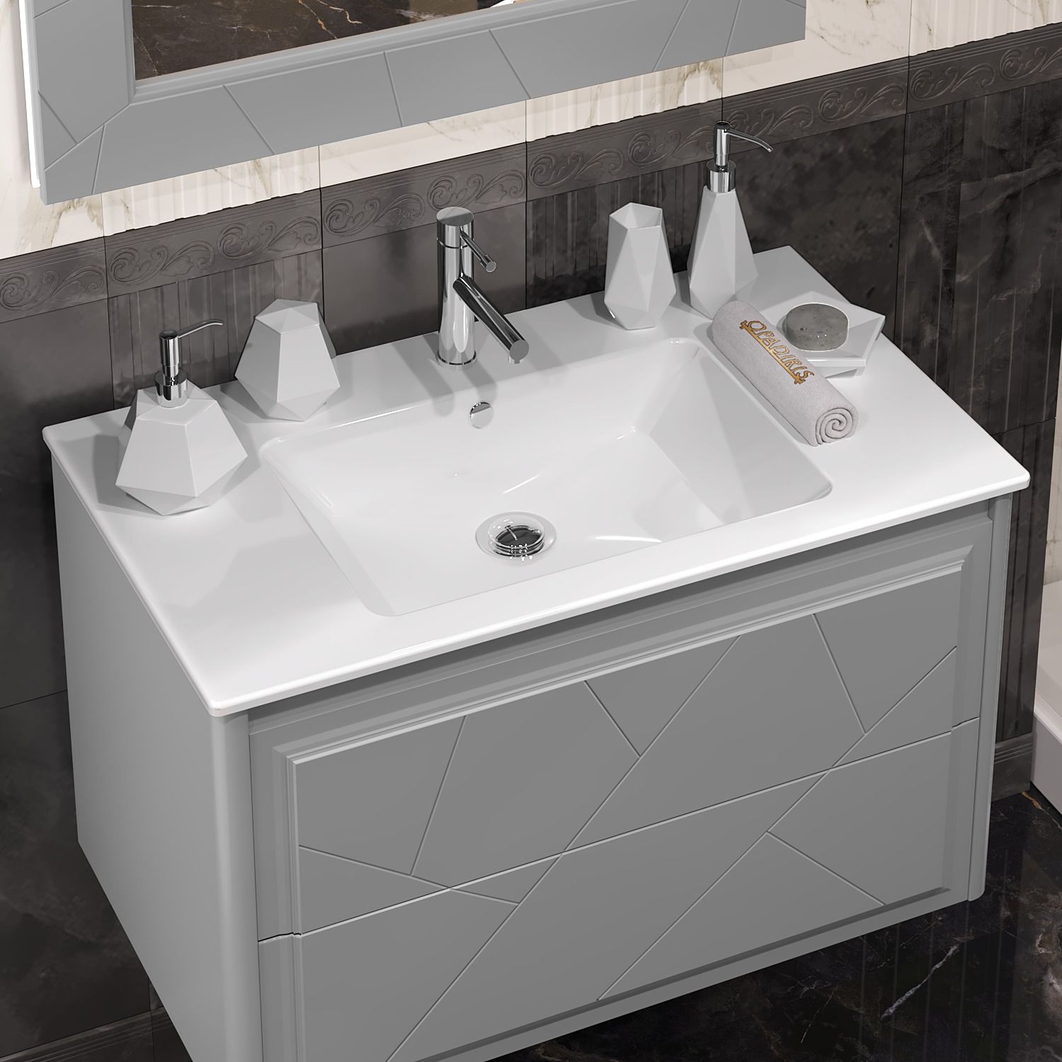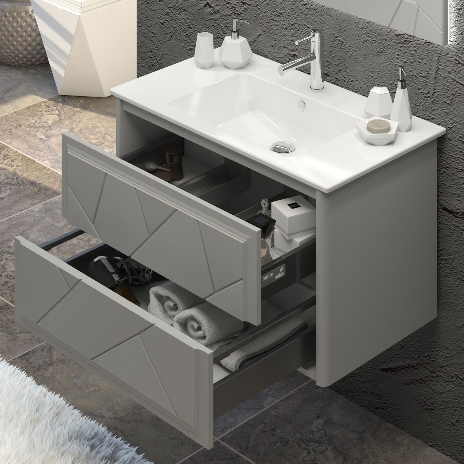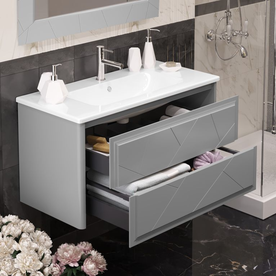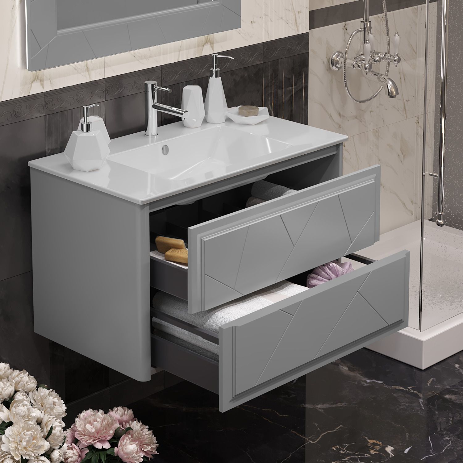 Фасад и корпус выполнены из высококачественного МДФ с эмалевым покрытием в глубокий матовый серый цвет. Это не просто красиво — это практично: эмаль устойчива к влаге, царапинам и ежедневному износу. Белая фаянсовая раковина с центральным расположением смесителя и диаметром слива 4,8 см обеспечивает удобство использования и легкость ухода.