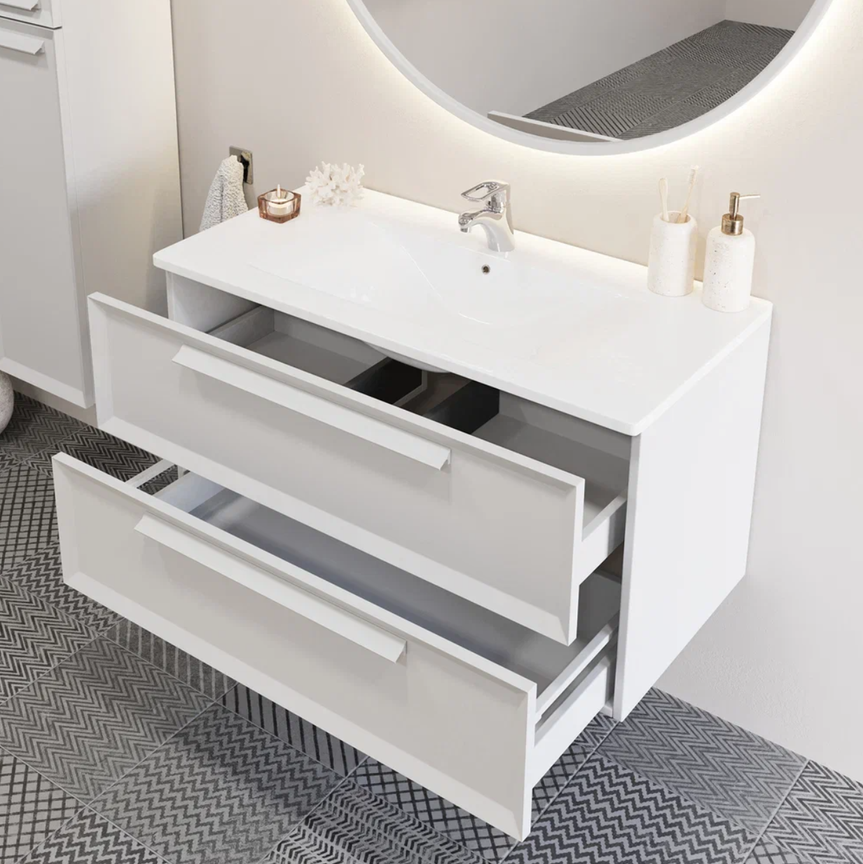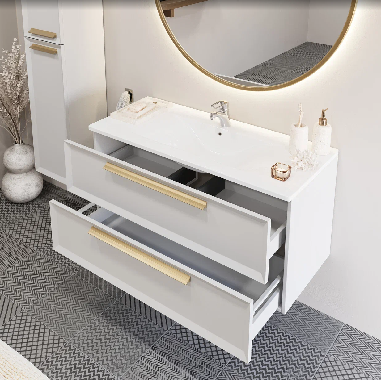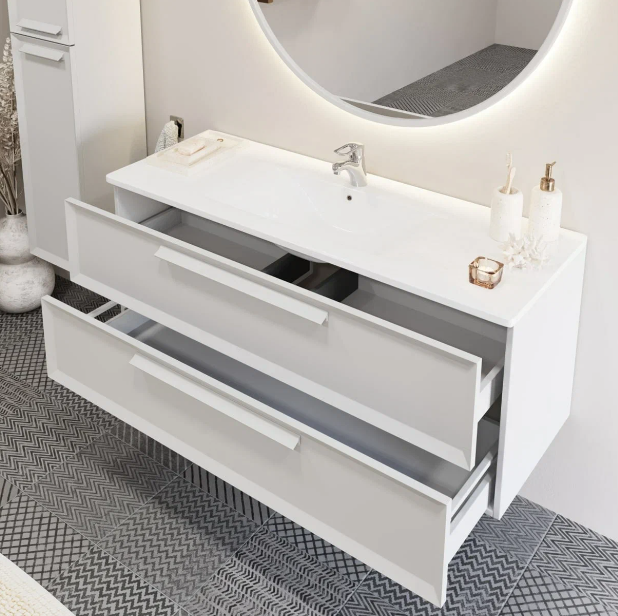 Одним из ключевых преимуществ модели является её подвесной монтаж. Это не только облегчает уборку пола в ванной, но и создаёт ощущение простора и лёгкости. Высота 50 см идеально подходит для комфортного использования людьми разного роста. Встроенная система доводчиков обеспечивает плавное и бесшумное закрывание ящиков — больше никаких хлопков и стуков по утрам или вечерам.