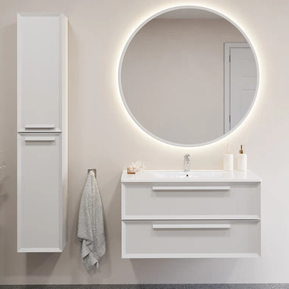 Тумба выполнена в классическом белом цвете с глянцевой поверхностью, которая визуально расширяет пространство и придаёт помещению свежесть и чистоту. Материал фасада — МДФ с эмалевым покрытием, что гарантирует долговечность и устойчивость к влаге. Раковина изготовлена из высококачественного фаянса, известного своей прочностью и гигиеничностью. Глубина тумбы составляет 46 см, что позволяет разместить все необходимые средства для ухода, не загромождая пространство.
