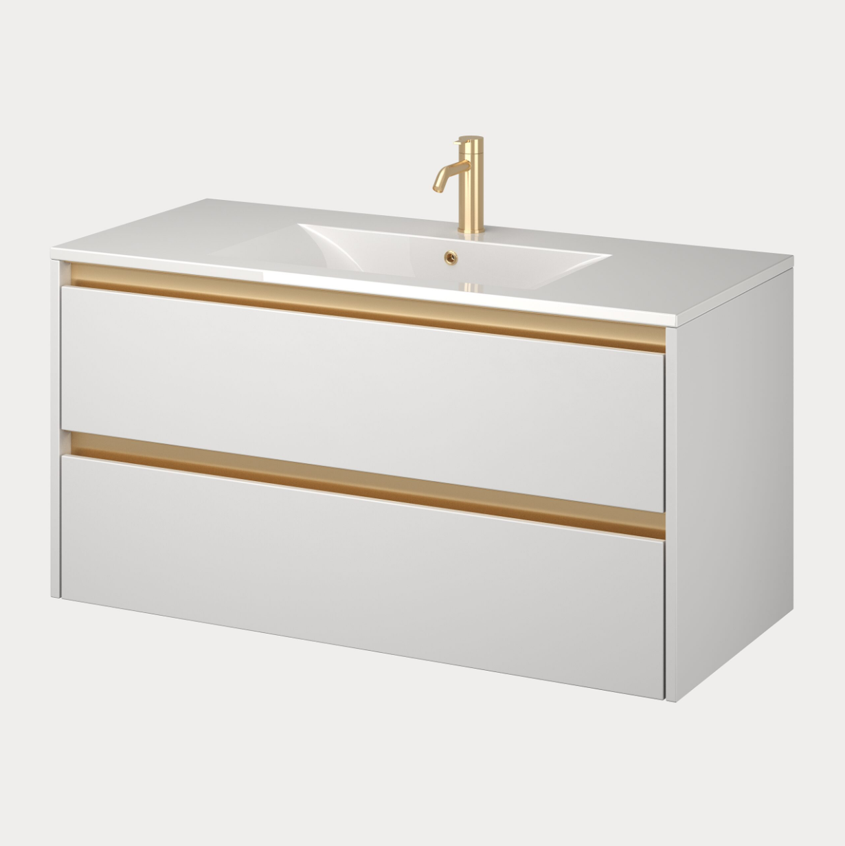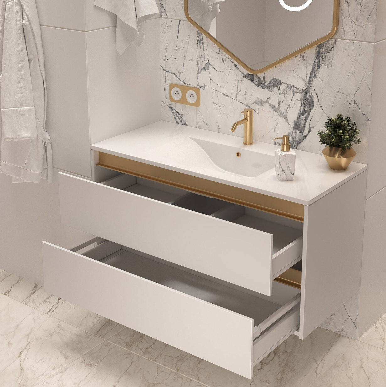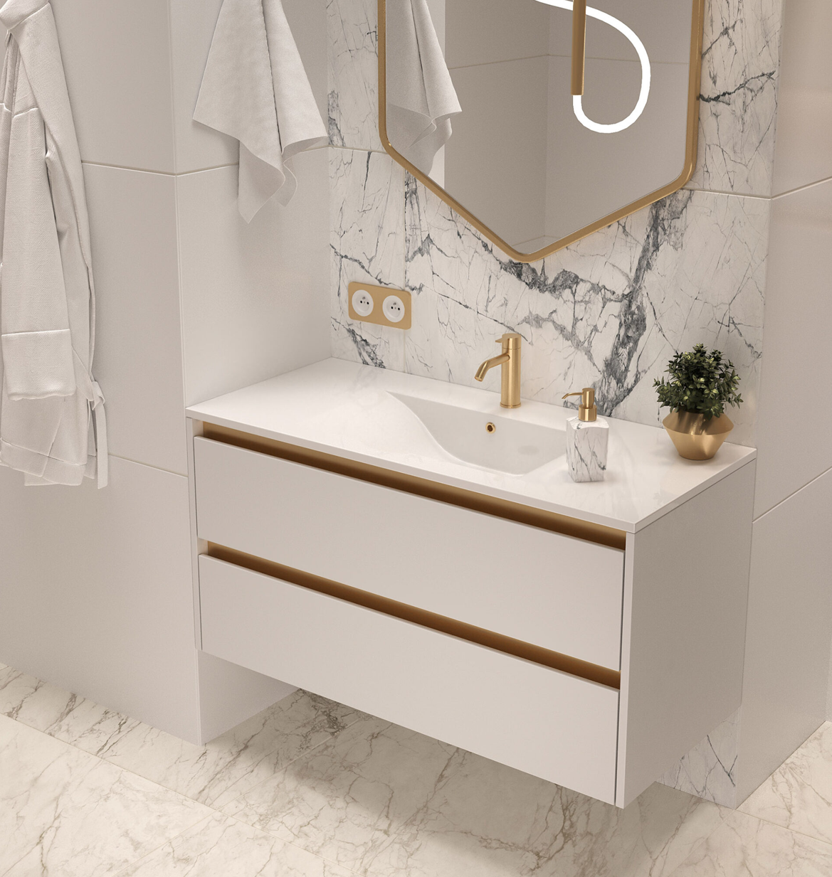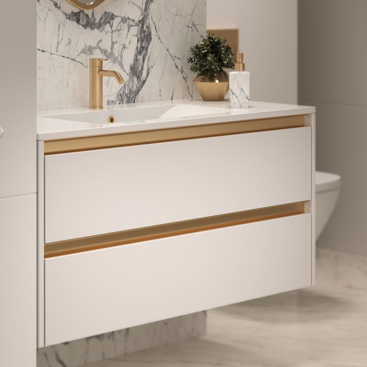 Тумба Luxor-2 90 выполнена из прочного МДФ с ламинированным покрытием, что гарантирует долговечность и устойчивость к влаге. Глянцевые фасады и корпус белого цвета создают эффект лёгкости и чистоты, а золотистая фурнитура добавляет изысканности. Подвесная конструкция визуально расширяет пространство и упрощает уборку пола.