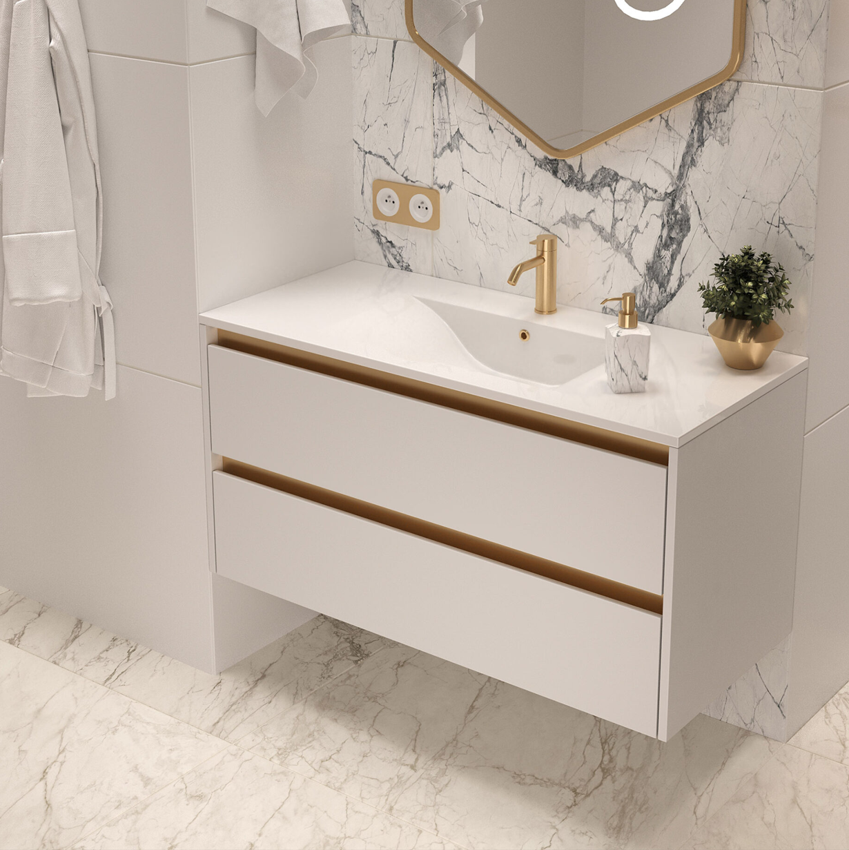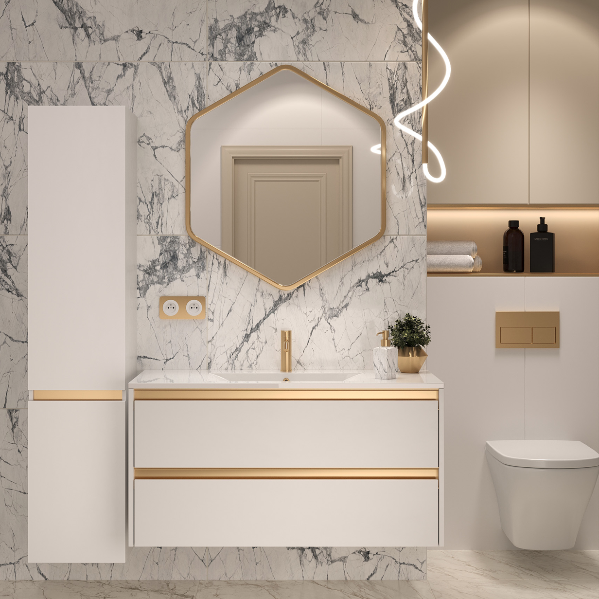Система хранения продумана до мелочей: вместительный ящик с доводчиками позволяет бесшумно закрывать дверцу и аккуратно хранить все необходимое — от полотенец до бытовой химии. Механизм доводчика — это не просто удобство, это забота о тишине в доме и долговечности фурнитуры. Вы можете выбрать цвет фурнитуры: белый, золотой, хром или черный — чтобы идеально вписать тумбу в ваш интерьер.