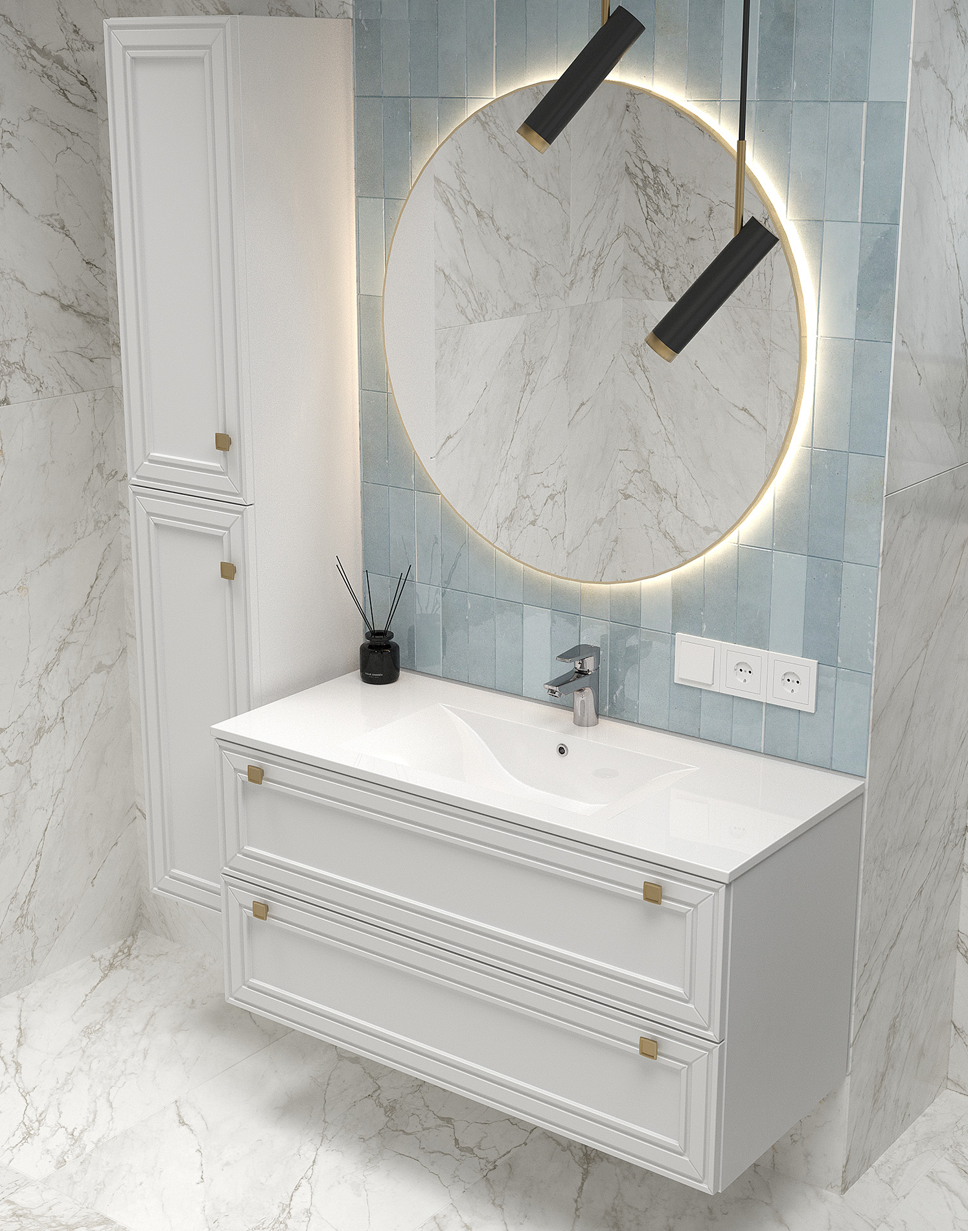 Материал фасада — МДФ, покрытый прочной эмалью, гарантирует долговечность и защиту от влаги. Матовое покрытие придаёт поверхности изысканный вид и не оставляет отпечатков пальцев, что особенно важно в местах с частым контактом. Цвет корпуса и фасада — белый, создающий ощущение чистоты и простора. Вы можете выбрать цвет фурнитуры из нескольких вариантов: белый, золотой, хром или черный, чтобы подчеркнуть ваш индивидуальный стиль.