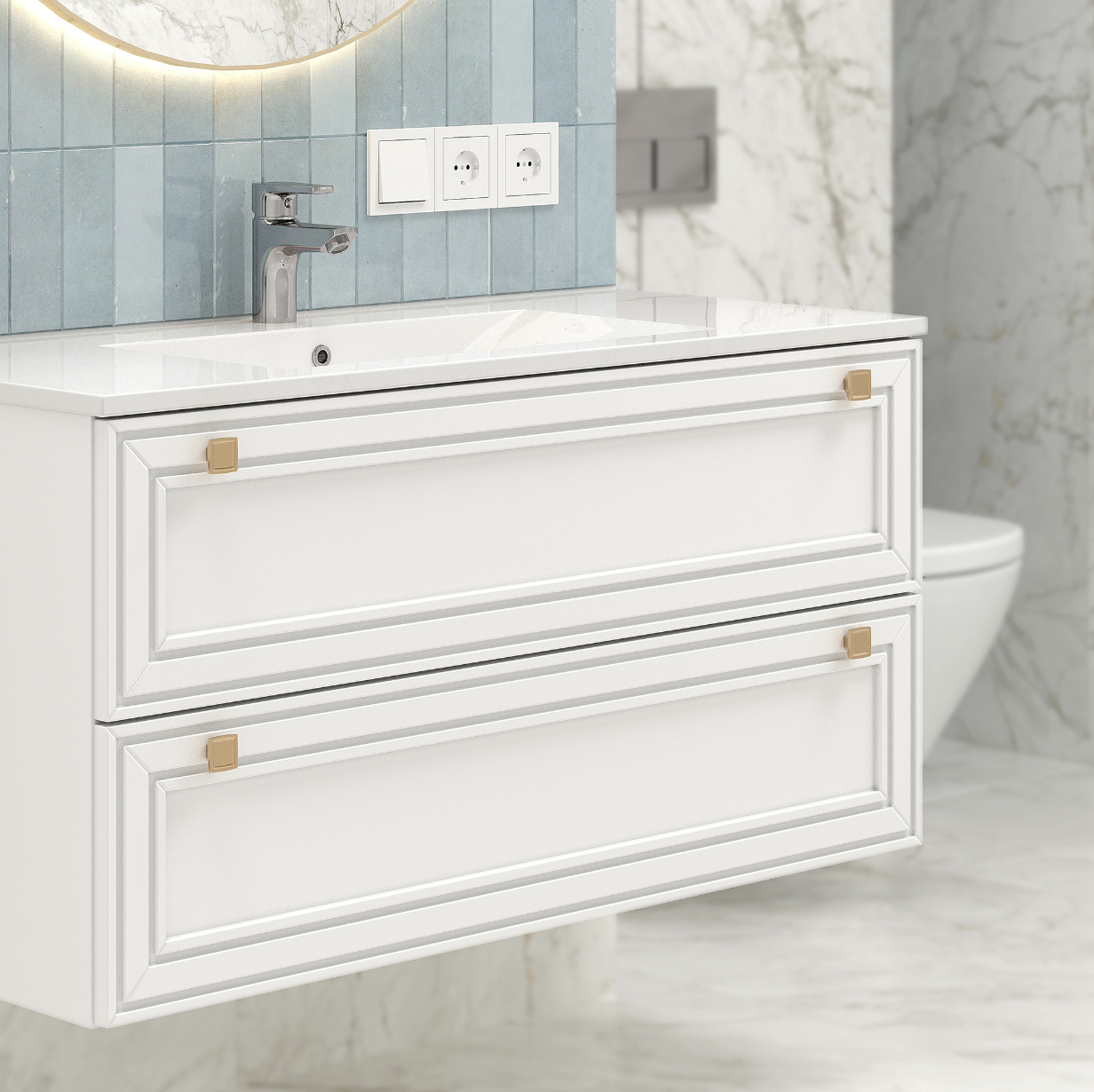 Вместительный ящик с мягким доводчиком позволяет аккуратно хранить полотенца, косметику и бытовую химию. Фурнитура представлена в нескольких вариантах: белая, золотая, хромированная и чёрная — вы легко подберёте оттенок под свой интерьер. Раковина из фаянса дополняет комплект, обеспечивая гигиеничность и простоту ухода.