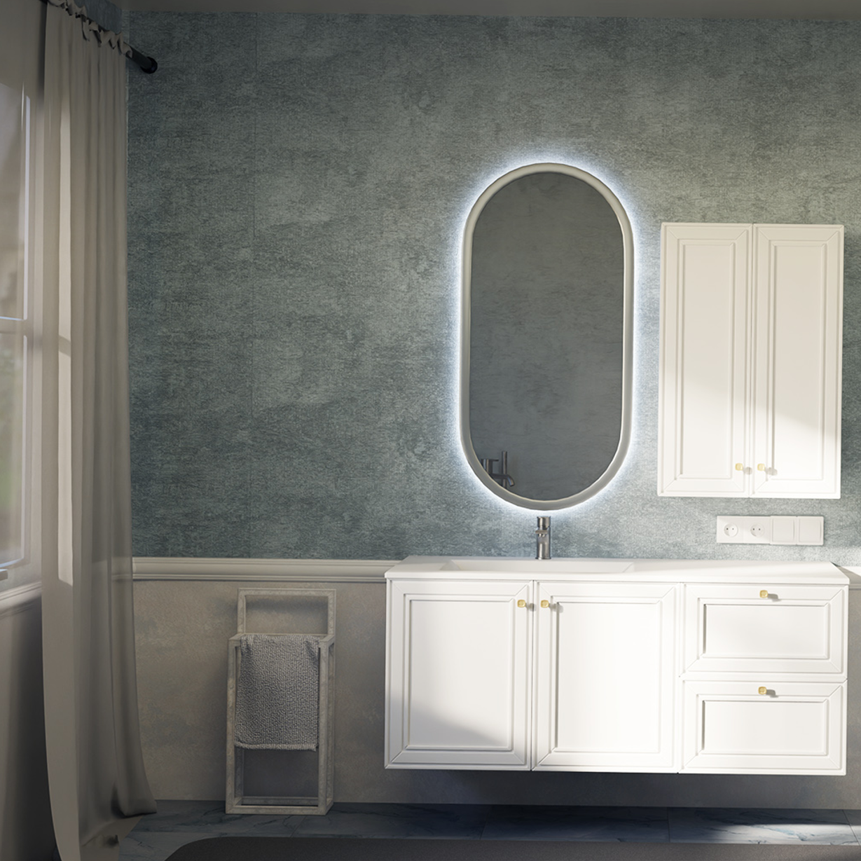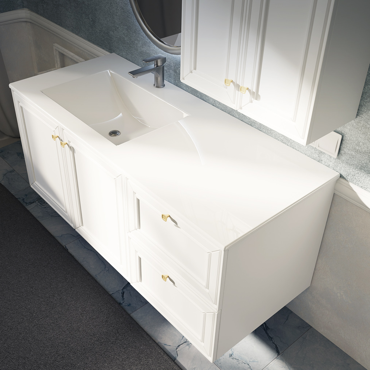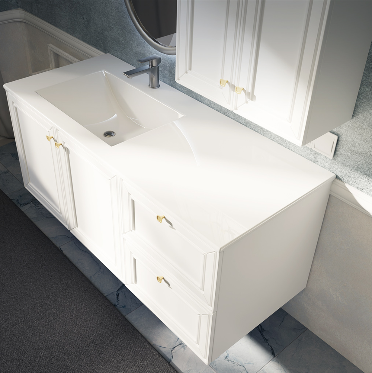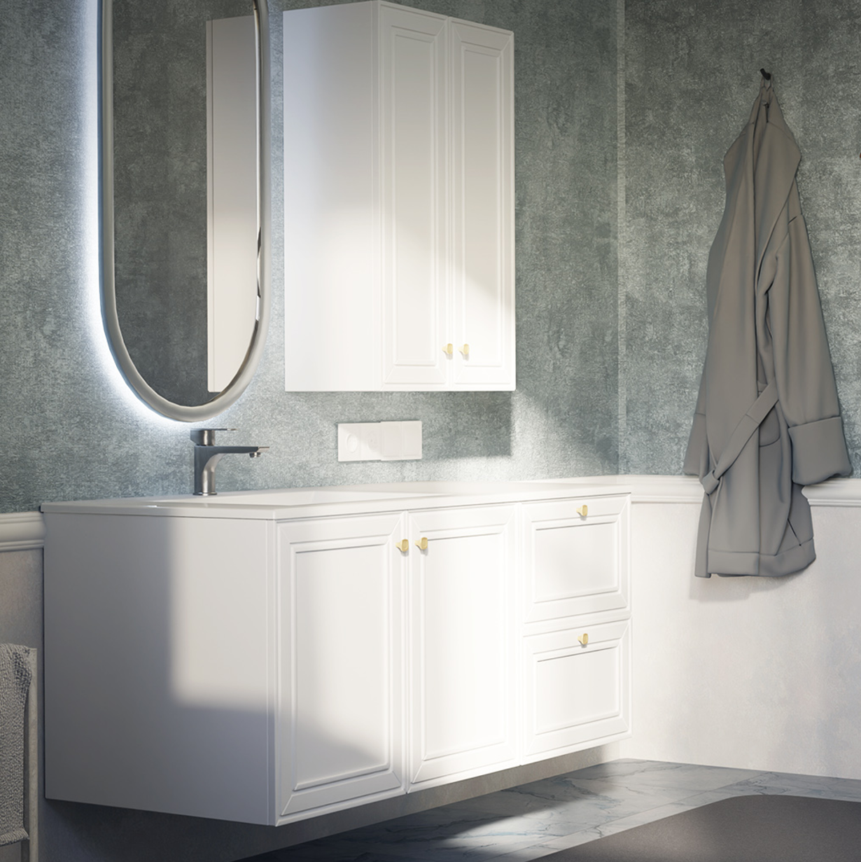 Фасад и корпус выполнены из прочного МДФ с матовым эмалевым покрытием, что обеспечивает долговечность и устойчивость к влаге. Белый цвет создаёт ощущение свежести и простора, а прямоугольная форма придаёт строгость и лаконичность. В коллекции Августо особое внимание уделено деталям: фурнитура представлена в нескольких оттенках — белом, золотом, хроме и чёрном, что позволяет подобрать вариант под любой стиль от минимализма до ар-деко.