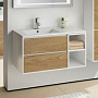 Конструкция оснащена надежными крепежными элементами, обеспечивающими устойчивость и безопасность. Внутри предусмотрены полки и ящики для хранения бытовой химии и аксессуаров, что позволяет поддерживать порядок в ванной комнате. Благодаря продуманной системе открывания ящиков доступ к содержимому максимально удобен.