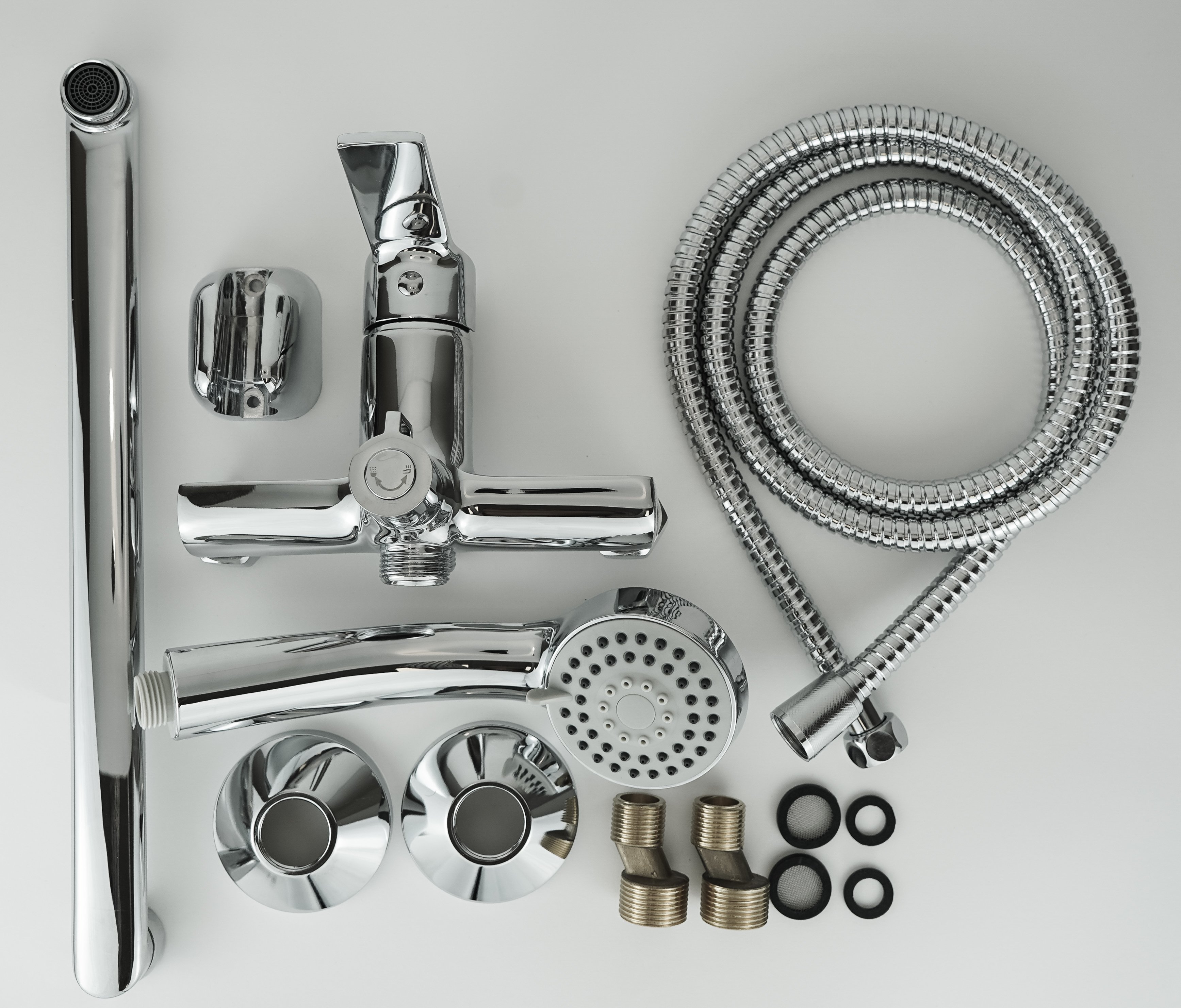 Излив с возможностью вращения добавляет гибкости при использовании, а в комплекте идёт душевой гарнитур с шлангом длиной 150 см — идеально для тех, кто любит комфортный приём душа. Два стандартных отверстия для монтажа и жесткая подводка с резьбой 1/2" упрощают установку и совместимы с большинством систем водоснабжения.