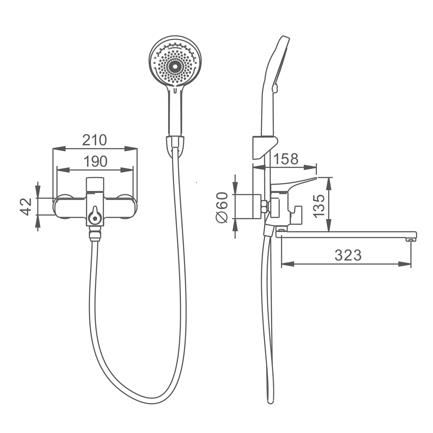 Смеситель Splenka S54.22.03 разработан для настенного монтажа и подходит для установки с двумя отверстиями. В комплекте идет душевой гарнитур со шлангом длиной 150 см, что делает его идеальным для ванны с душем. Жесткая подводка с резьбой 1/2" обеспечивает надежное подключение к водопроводу.