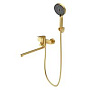 Созданный в стиле современного дизайна, этот универсальный смеситель станет украшением любой ванной комнаты. Его круглая форма и сатиновое золотое покрытие придают изделию особый шарм, делая его центром внимания. Латунь — материал, из которого изготовлен корпус, гарантирует долговечность и устойчивость к коррозии, а также приятную на ощупь поверхность.