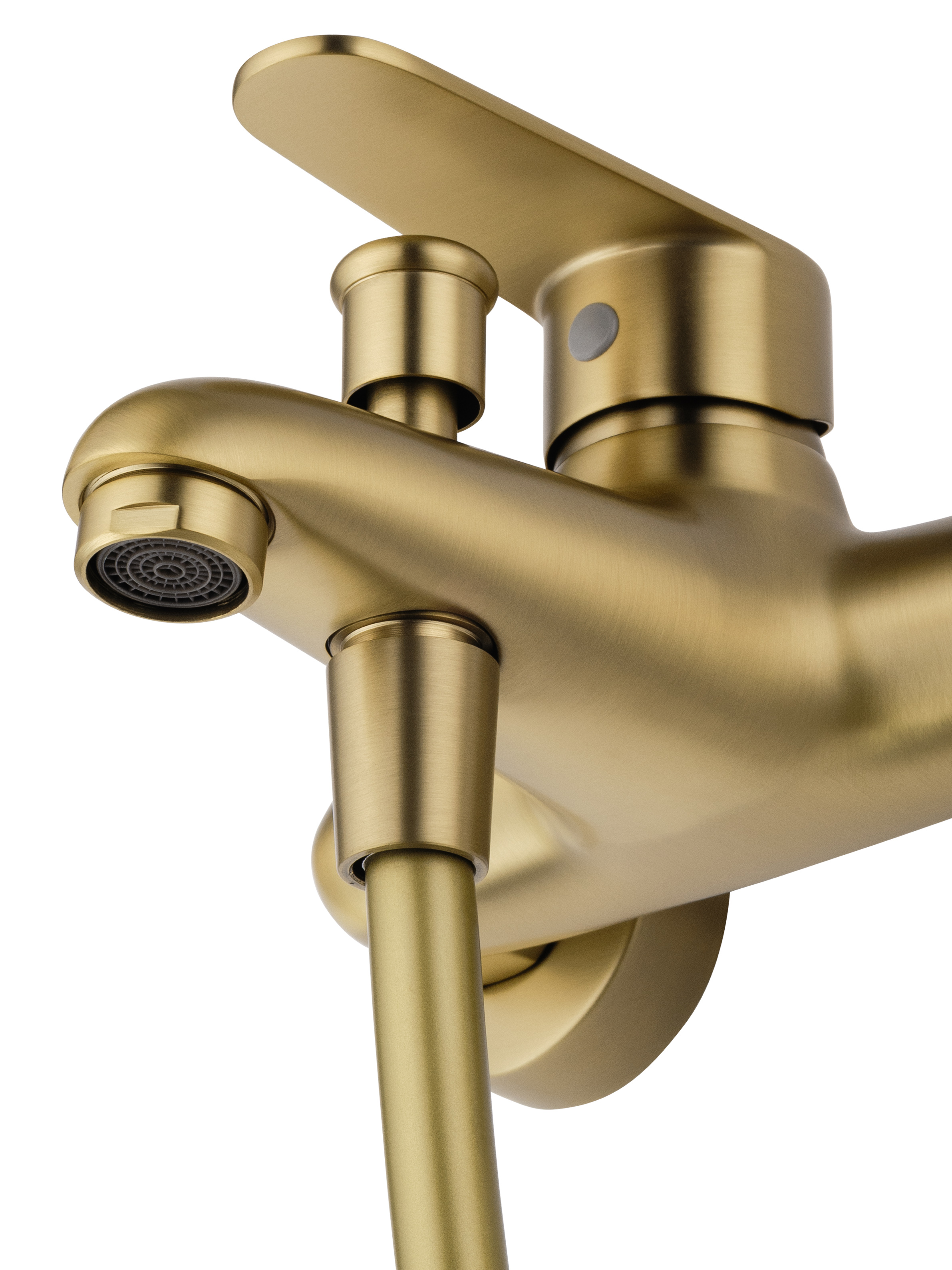 Этот смеситель выполнен в роскошном золотом брашированном цвете, который не только выглядит элегантно, но и устойчив к царапинам и потускнению. Благодаря специальному брашированному покрытию поверхность всегда выглядит свежо и аккуратно, а мягкая текстура приятна на ощупь. Ручка управления выполнена в виде удобного рычага, расположенного сверху, что позволяет легко регулировать напор и температуру воды даже мокрыми руками.