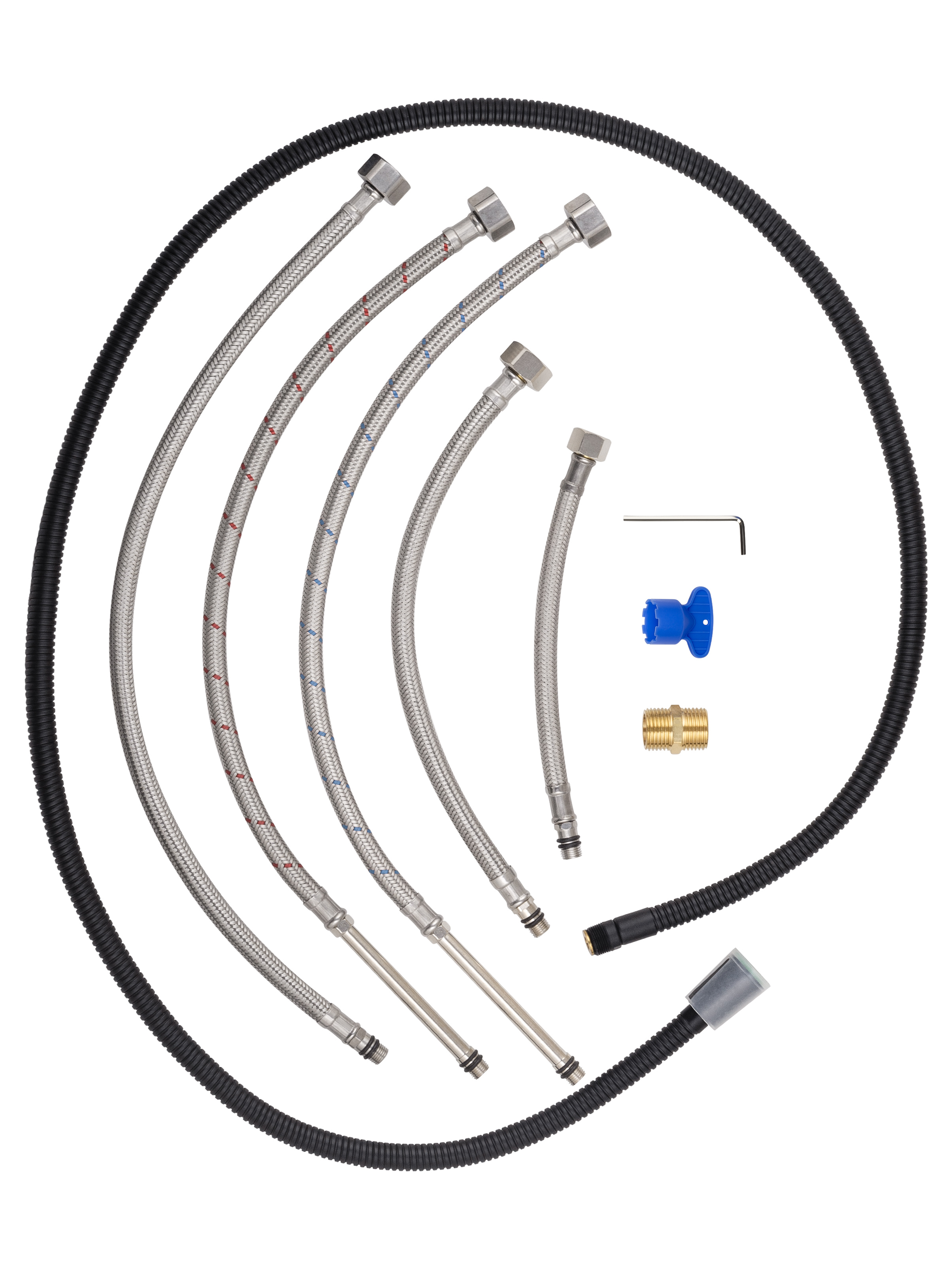 Смеситель оснащен гибкой подводкой стандартного размера 1/2", что упрощает установку и совместимость с большинством систем водоснабжения. Длина шланга составляет 150 см, а защита от перекручивания позволяет использовать лейку без ограничений, обеспечивая комфорт при принятии душа.