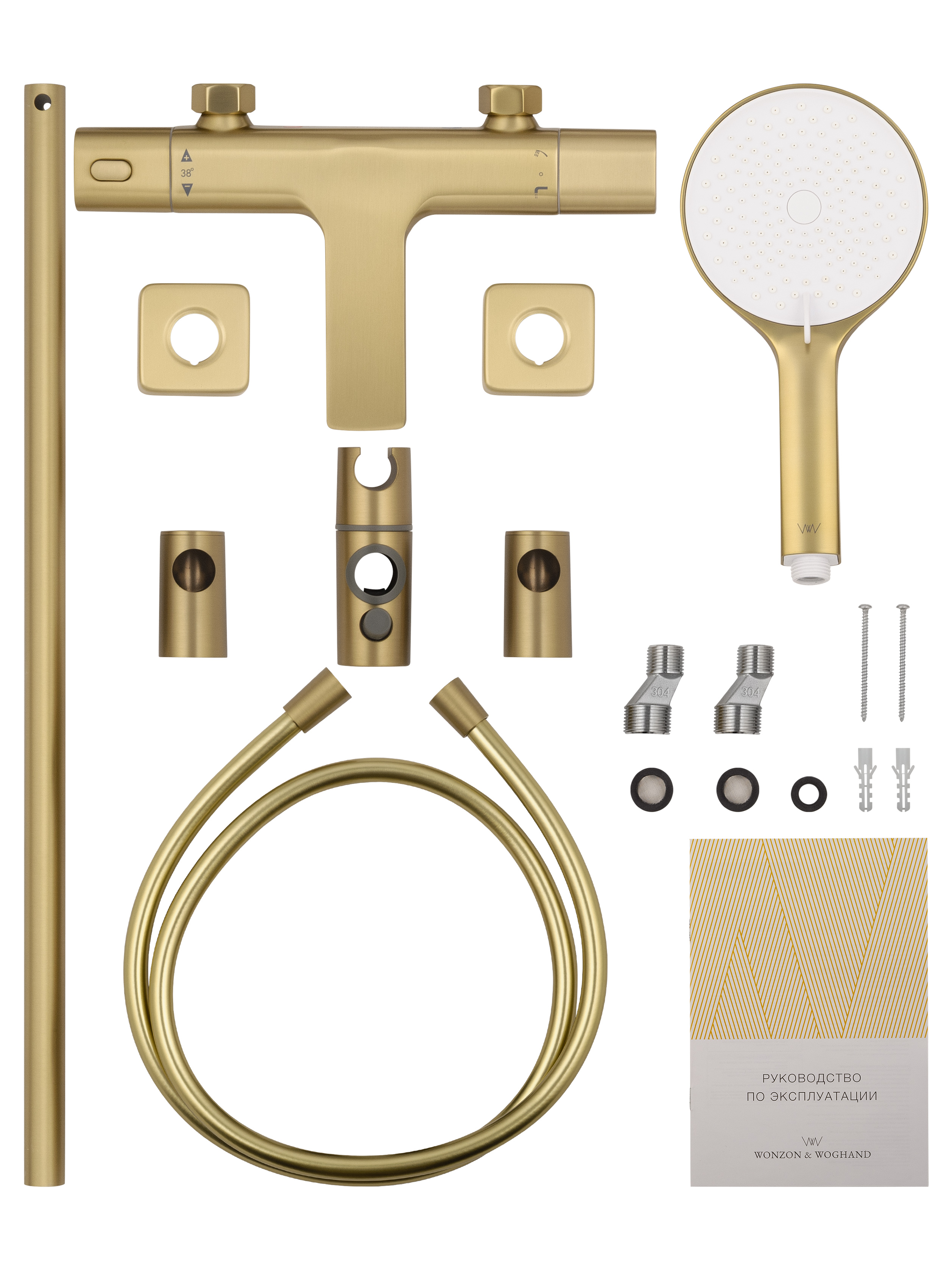 Смеситель для ванны Wonzon & Woghand Solid WW-C2011-A-BG с термостатом подходит для классических чаш с душем. Сантехника выдерживает интенсивную эксплуатацию, воздействие жесткой воды, оставаясь надежной и красивой. В цену 36145 рублей входит все, что нужно для установки смесителя.