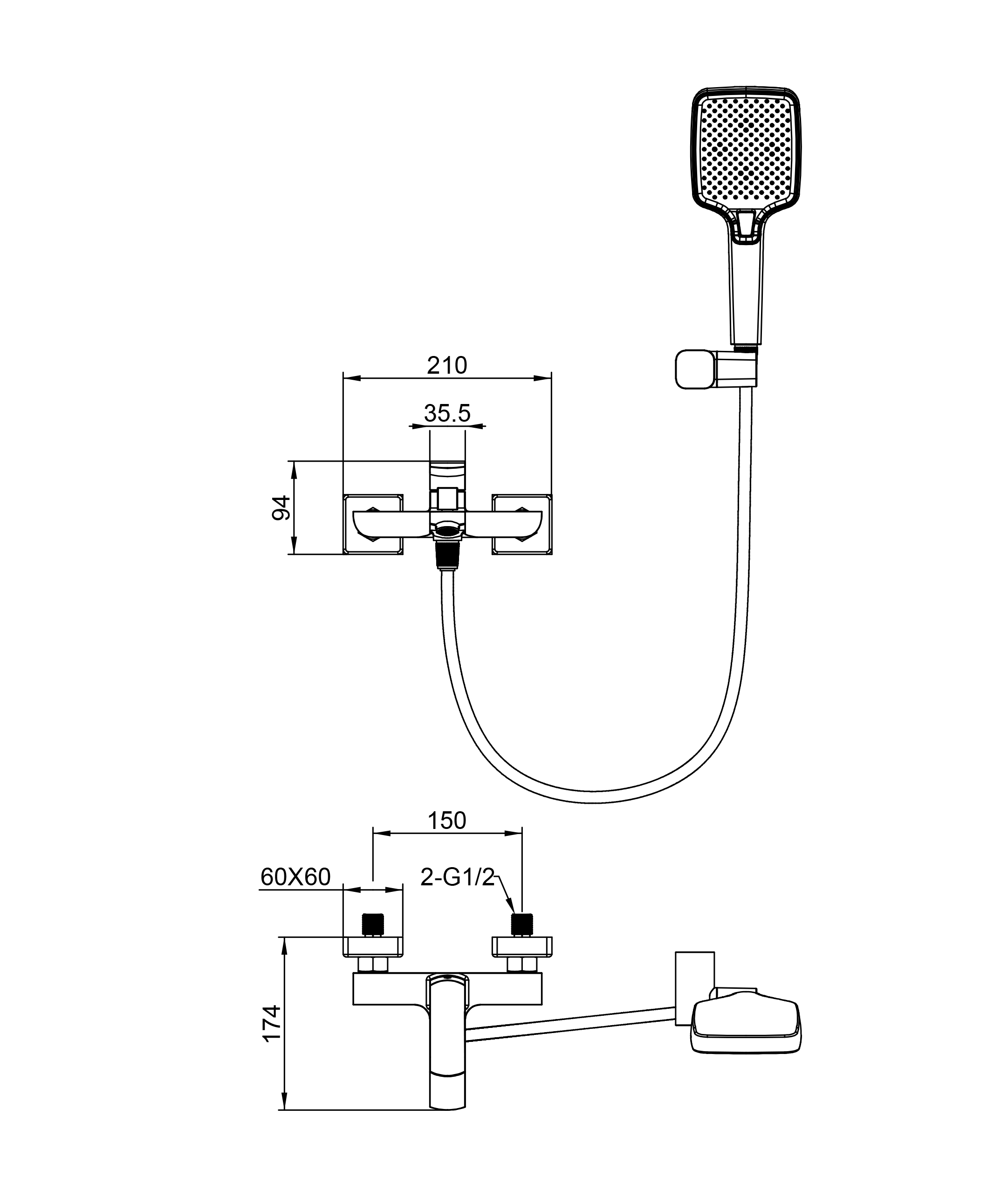 Монтаж настенный, что позволяет сэкономить место и придать ванной комнате аккуратный вид. Рычаг управления расположен сверху, что делает использование смесителя удобным и интуитивно понятным. В комплекте идёт гибкий шланг длиной 150 см и душевая лейка, что обеспечивает комфортный приём душа.