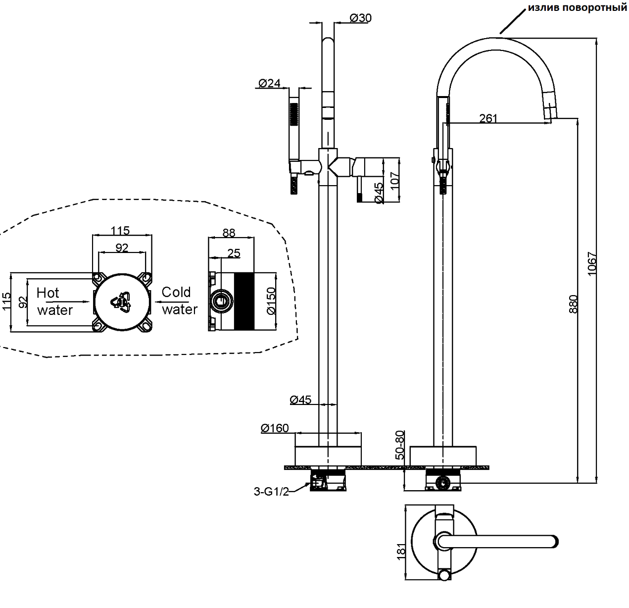 • Исполнение корпуса: излив, держатель душа и рычаг управления на корпусе