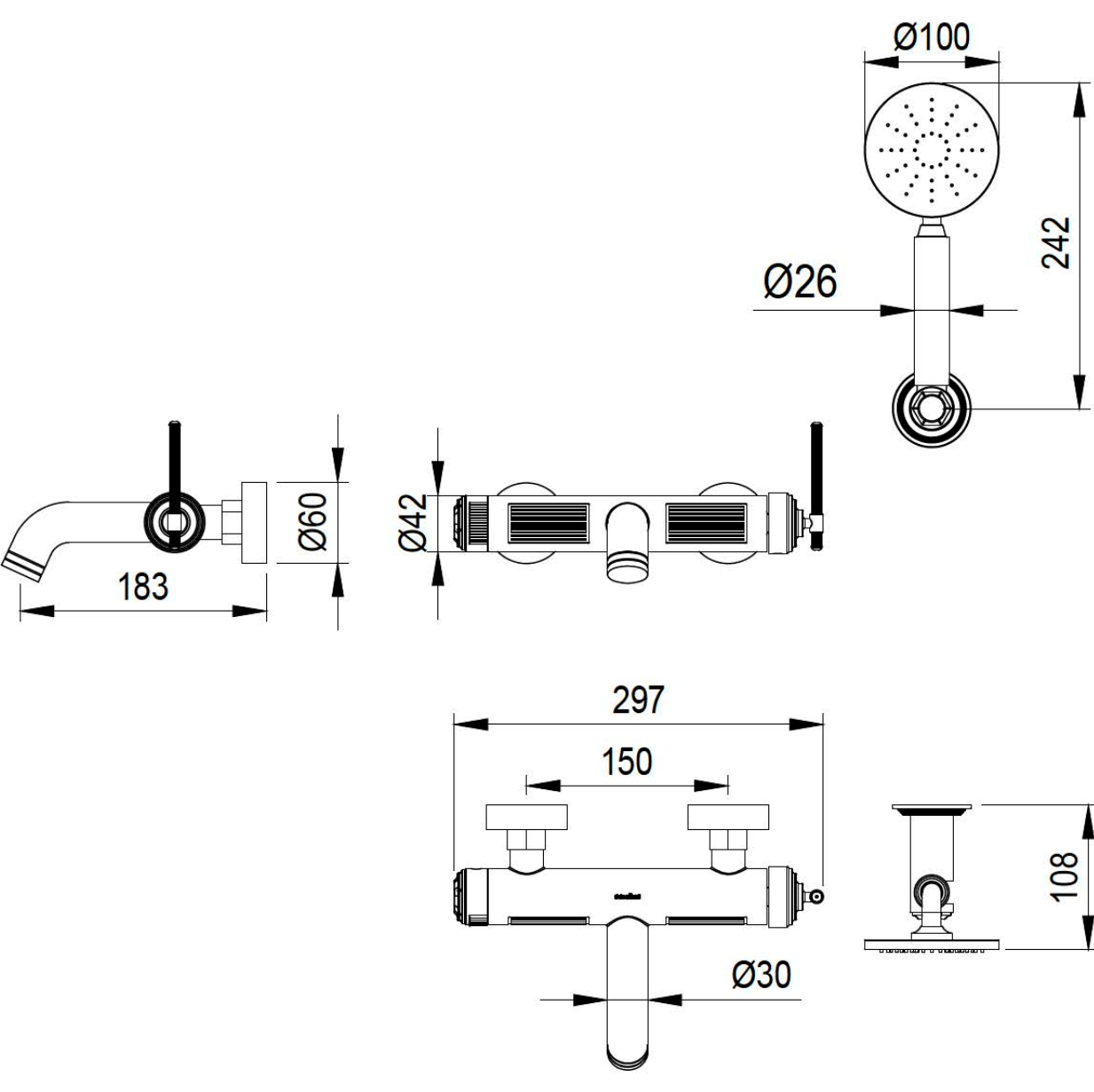 • Исполнение корпуса: излив, держатель душа и рычаг управления на корпусе